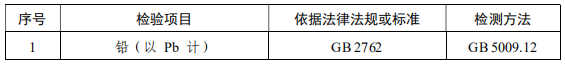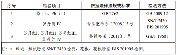 GB 2762 食品安全國家標準 食品中污染物限量 GB 5009.12 食品安全國家標準 食品中鉛的測定 GB 5009.227 食品安全國家標準 食品中過氧化值的測定 GB 5009.229 食品安全國家標準 食品中酸價的測定 GB/T 19681 食品中蘇丹紅染料的檢測方法 高效液相色譜法 SN/T 2430 進出口食品中羅丹明 B 的檢測方法 BJS 201905 食品中羅丹明 B 的測定 香辛料類抽檢項目: